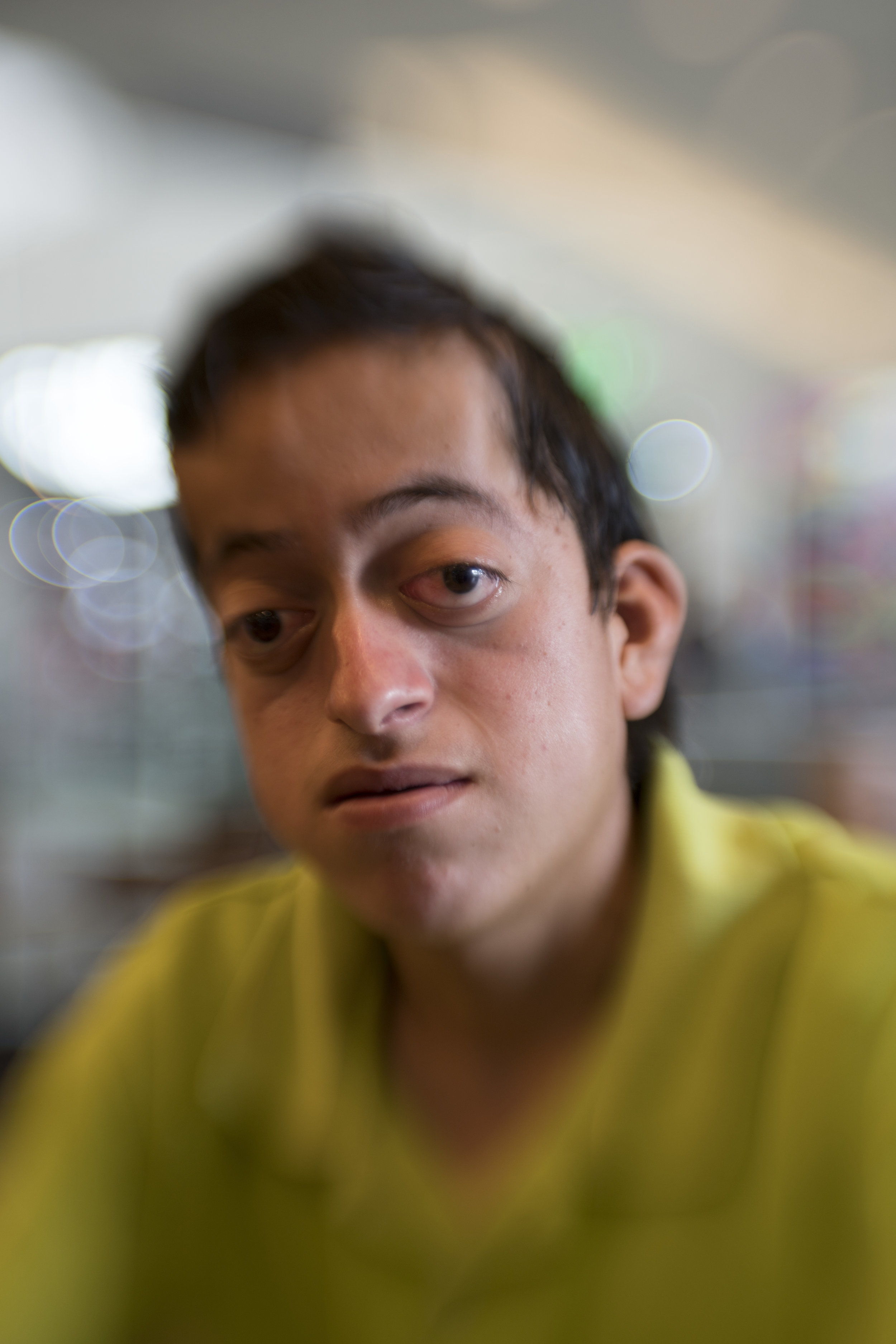 A young man with Cruzon's Syndrome. He is losing his vision and suffers from debilitating headaches due to the tremendous pressure the shape of his cranium inflicts on his eyes. His need for surgery that will relieve his daily pain is critical, though no surgeon is able or willing to offer treatment in his country. San Salvador, El Salvador. 2017.